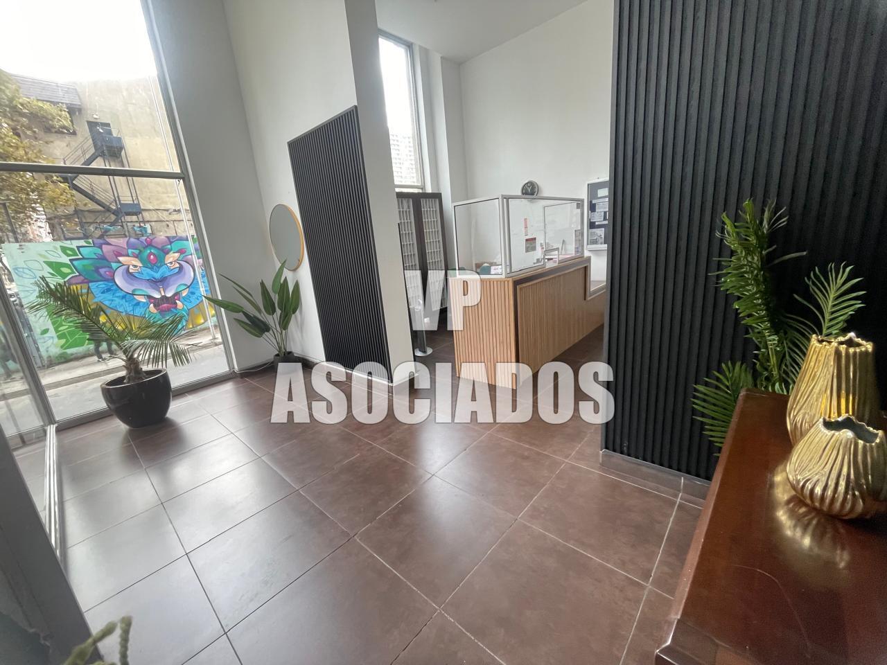 Este departamento se encuentra en un edificio de gran altura, ubicado en una zona urbana consolidada. La propiedad cuenta con una superficie total y útil de 22 m², ofreciendo un ambiente principal, cocina independiente y un baño completo. El acceso al departamento es a través de un pasillo interior, y el espacio principal dispone de ventanas que permiten la entrada de luz natural y vistas hacia la ciudad. La cocina está equipada con muebles superiores e inferiores, cubierta y espacio para electrodomésticos, mientras que el baño incluye lavamanos, inodoro y ducha. El departamento permite la tenencia de mascotas, lo que lo hace adecuado para quienes buscan esta característica.