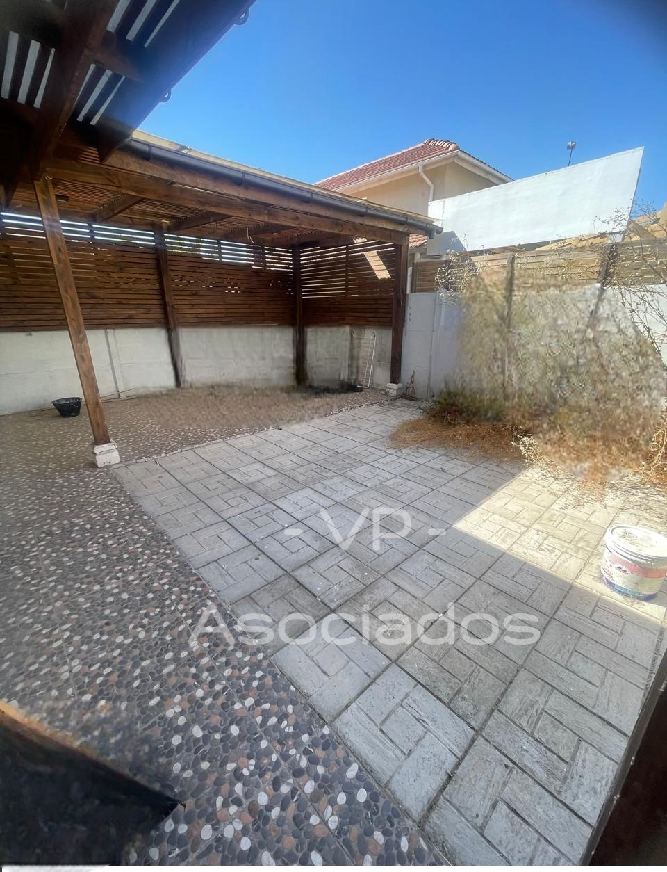 Patio con terraza techada y pequeña bodega, ante jardín con estacionamiento para vehículo.